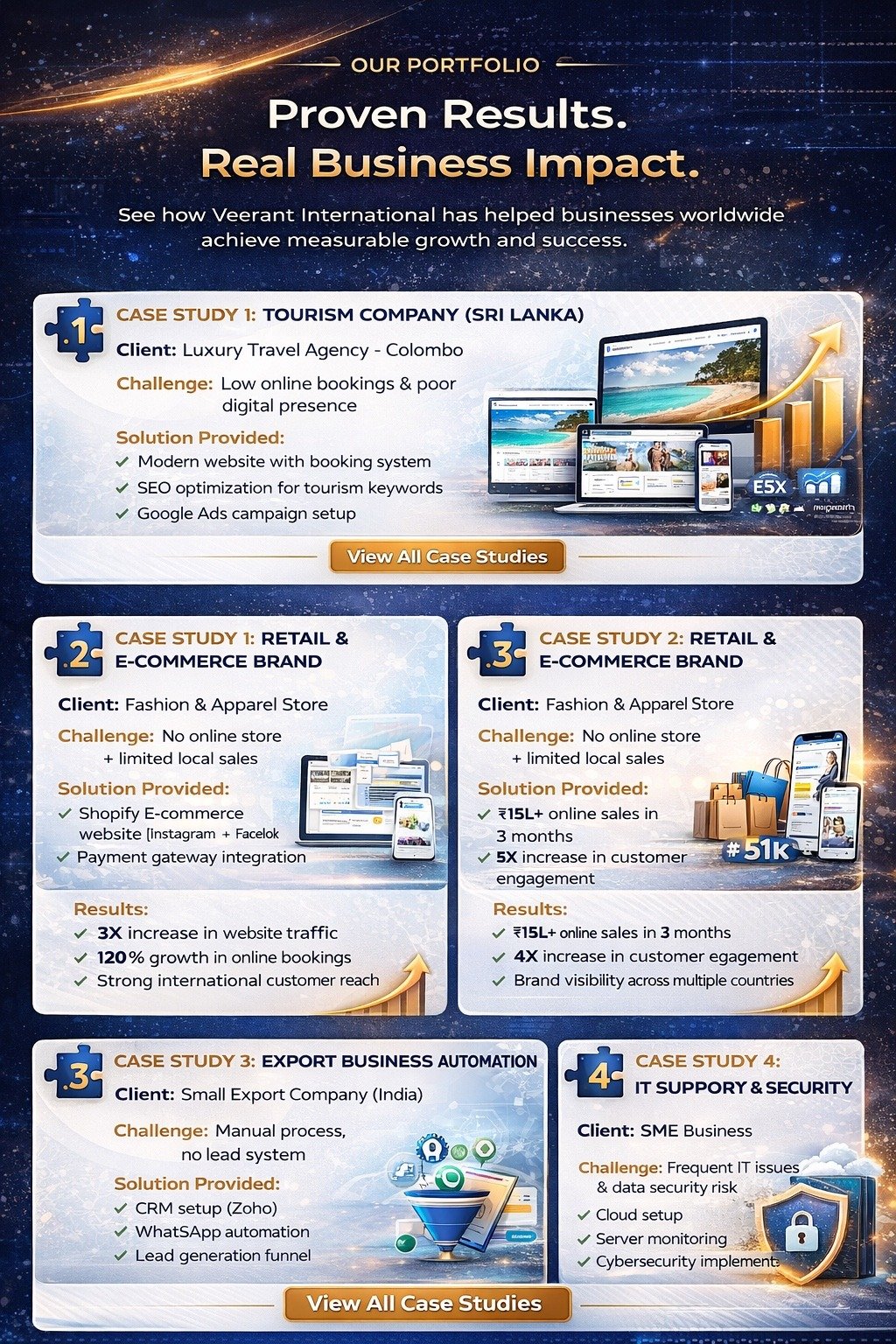 At Veerant International Trade Pvt. Ltd., we deliver comprehensive IT, marketing, and automation solutions designed to empower modern businesses in a competitive global landscape. Our approach goes beyond offering individual services—we build integrated digital ecosystems that streamline operations, enhance brand visibility, and drive measurable growth.